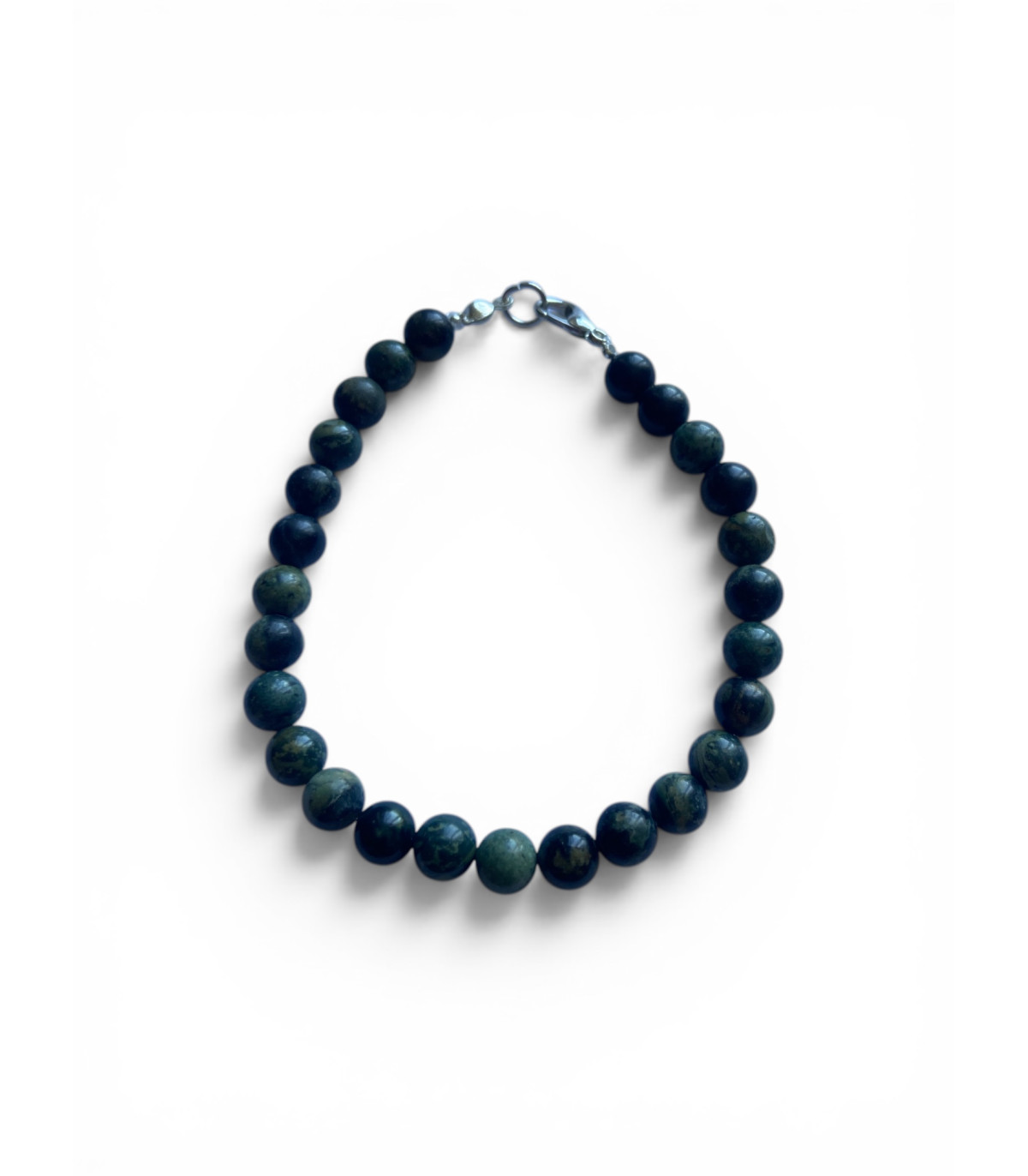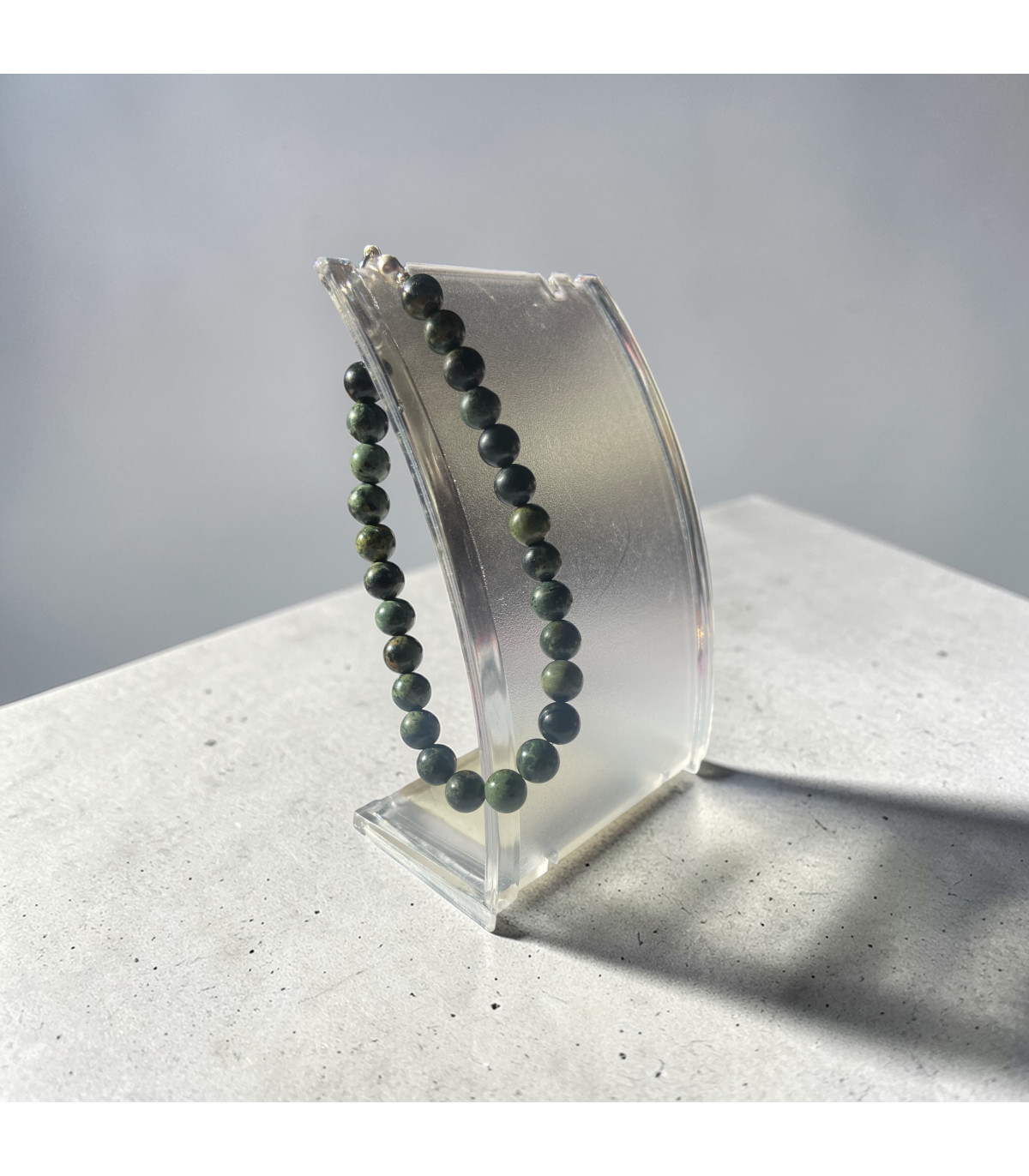 Le Jaspe Vert de Madagascar, souvent appelé "Green Point". C'est une pierre dense qui symbolise la force tranquille de la nature malgache. C'est une pierre rare.