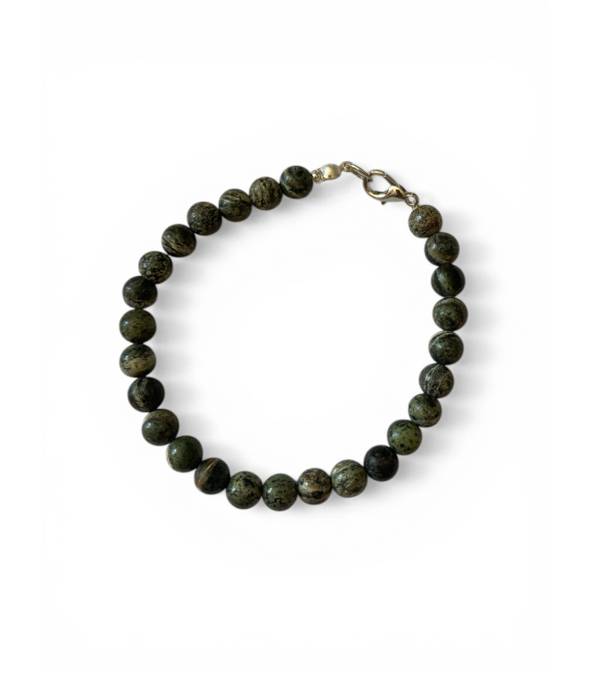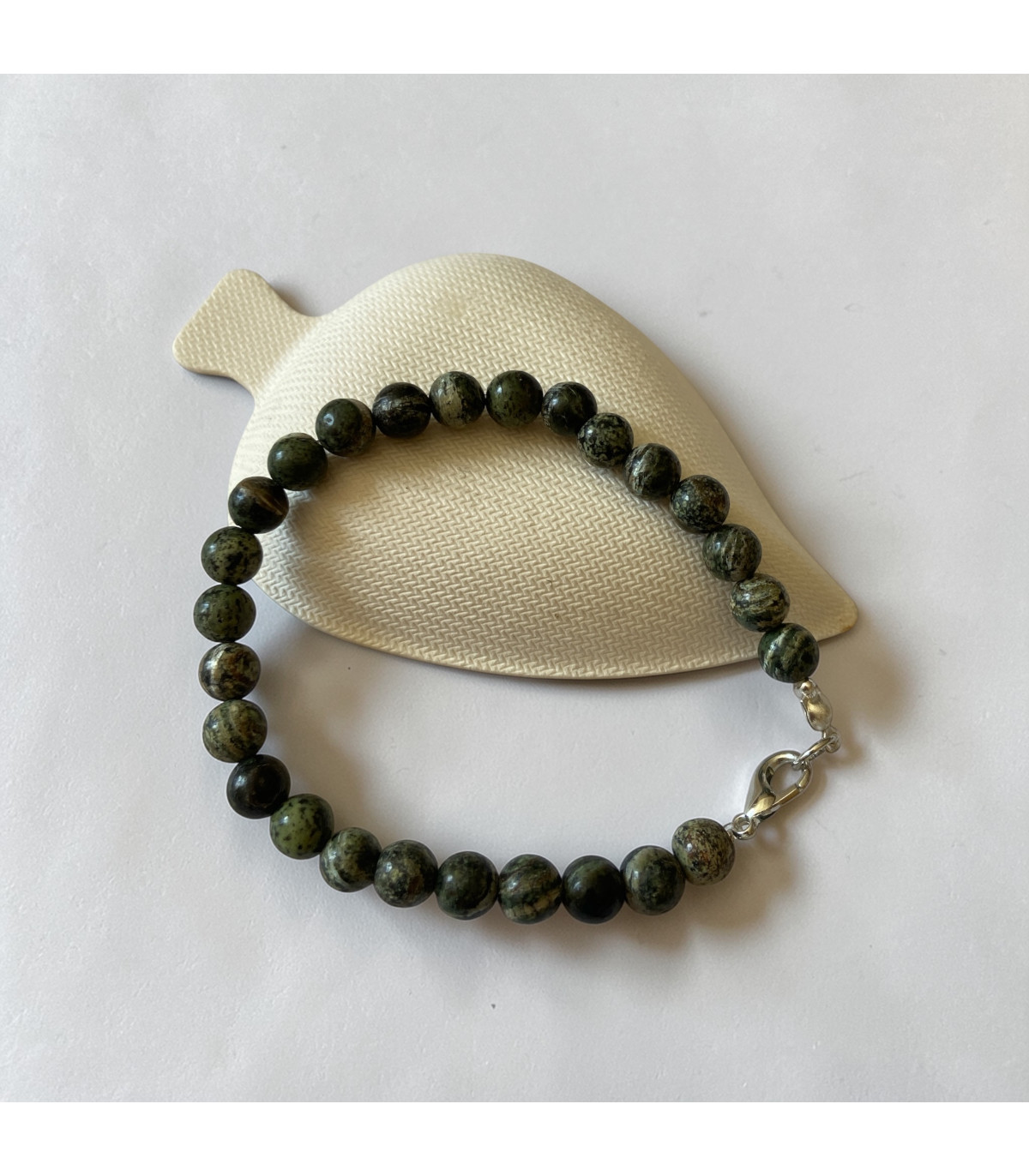 Le Jaspe Vert de Madagascar, souvent appelé "Green Point". C'est une pierre dense qui symbolise la force tranquille de la nature malgache. C'est une pierre rare.