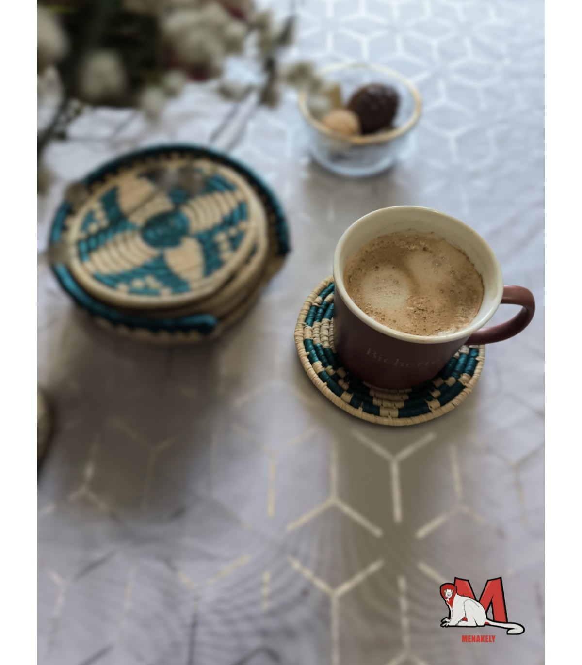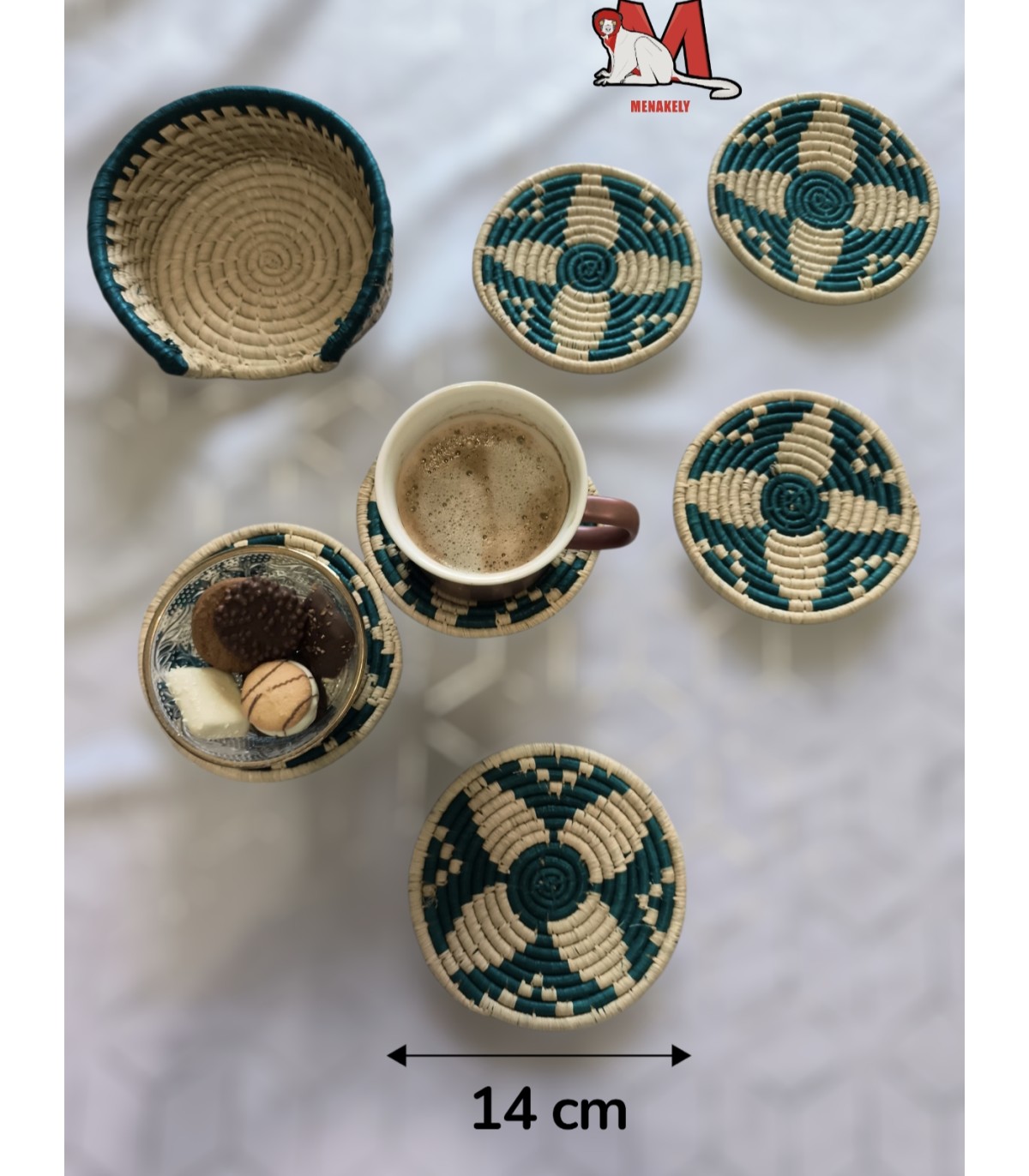 Tissés à la main à partir de raphia naturel dans des nuances beige clair et vert forêt, ces sous-verres incarnent le parfait équilibre entre matière brute et raffinement contemporain.