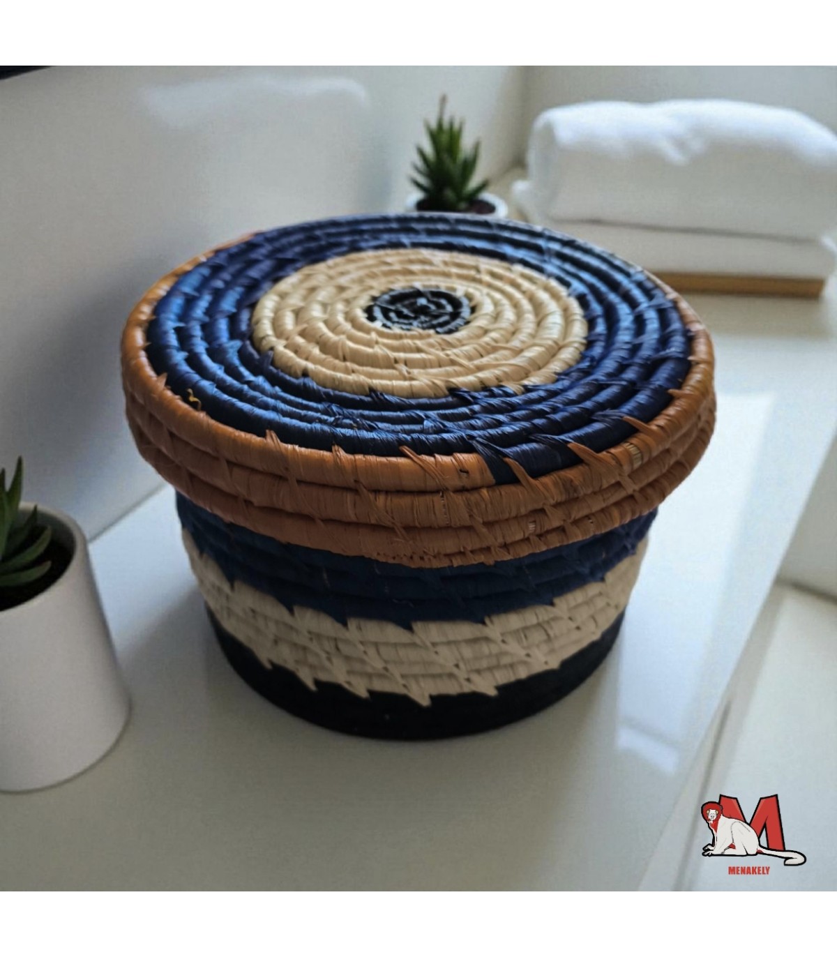 Le couvercle parfaitement ajusté, légèrement plus large, apporte une touche d’harmonie et d’équilibre à l’ensemble. Naturel, durable et esthétique, le raphia révèle ici toute sa noblesse à travers un objet à la fois pratique et décoratif.