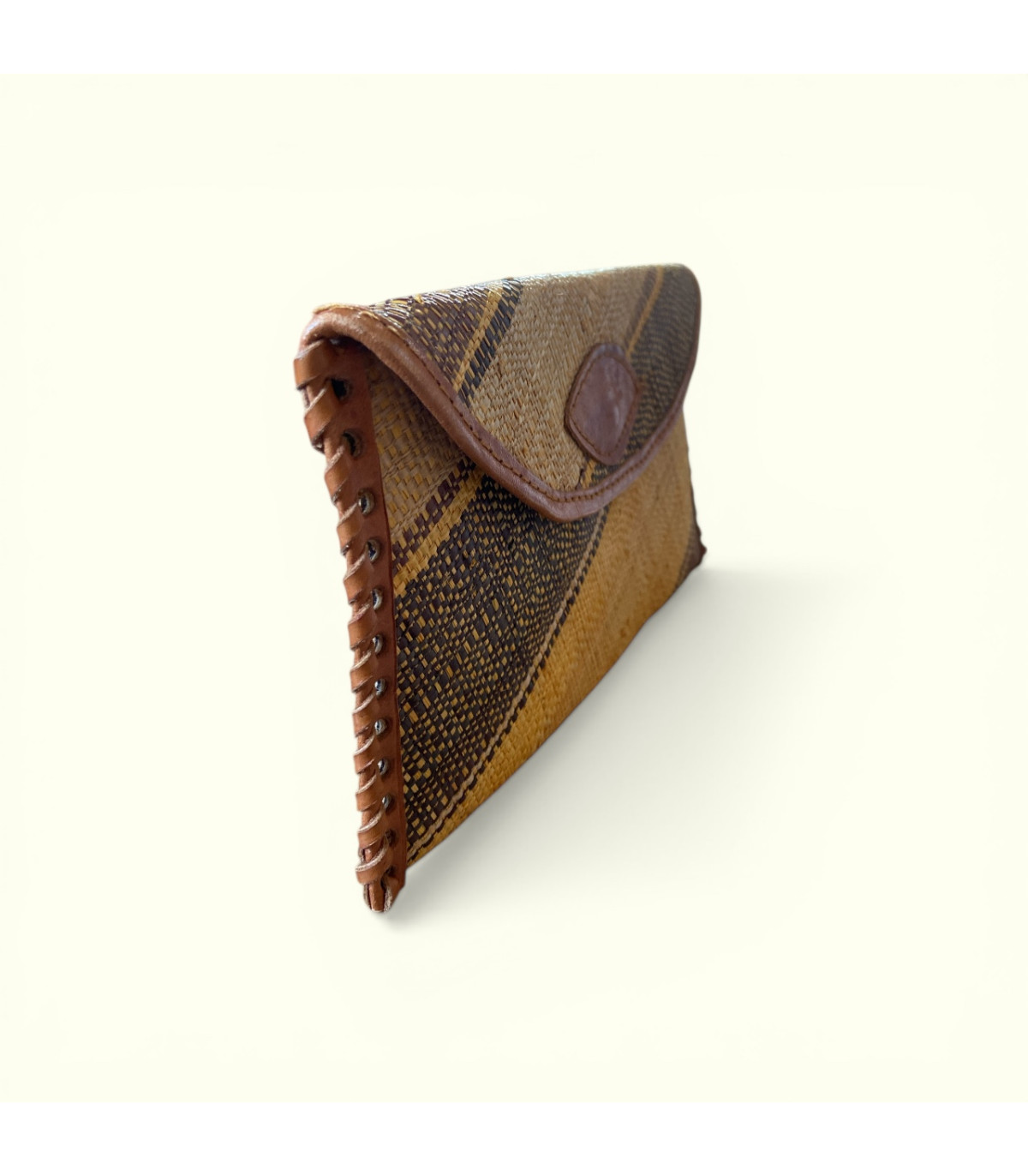 Pochette fine en raphia, fait main à Madagascar, poche à l'intérieur, finition cuir extérieur